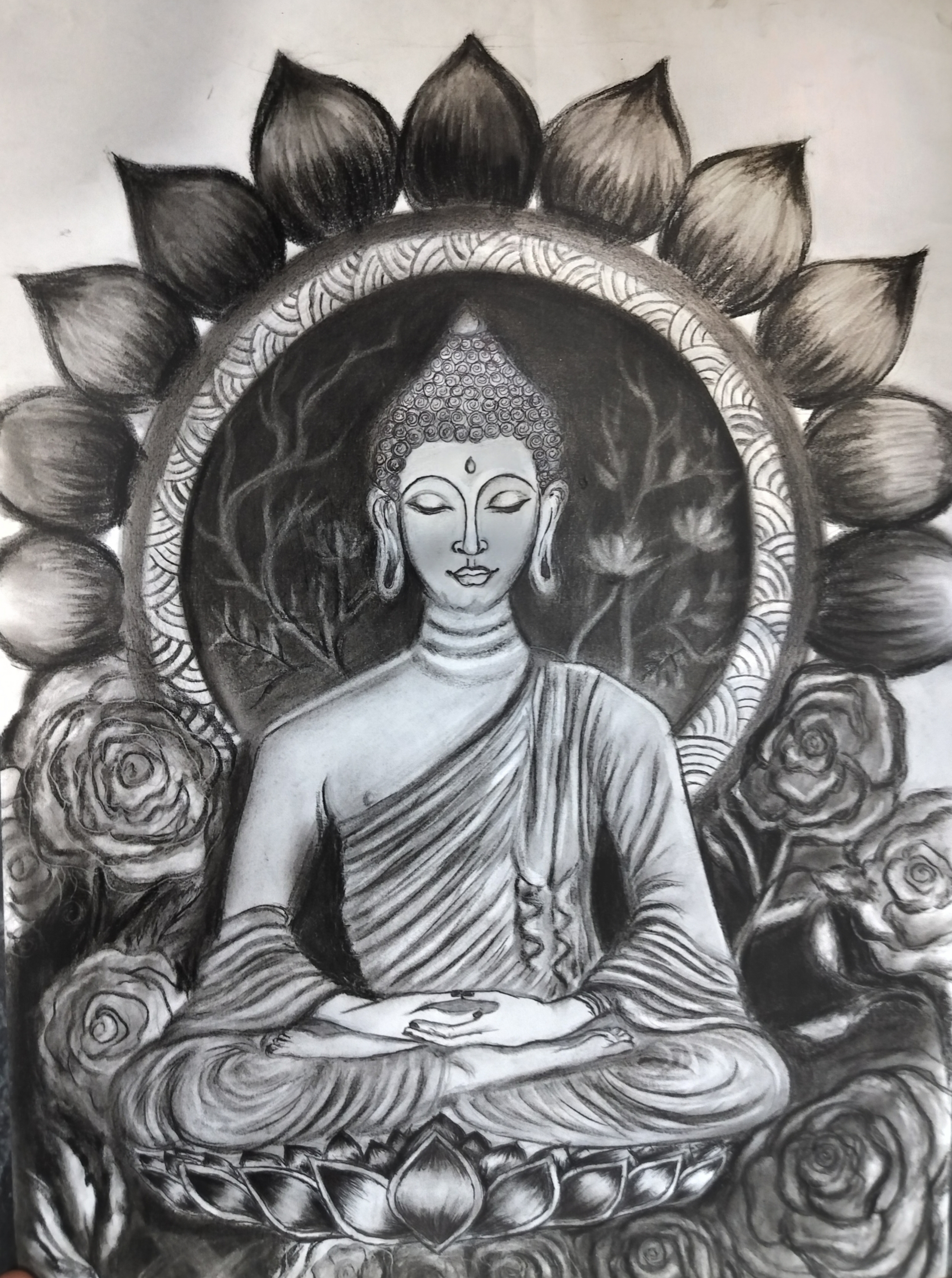 This hand-drawn artwork portrays the serene moment of inner awakening, inspired by the life and teachings of Gautama Buddha. Seated in deep meditation, the figure rests upon a blooming lotus, a timeless symbol of purity rising above worldly suffering. The gentle stillness in his expression invites the viewer into a space of silence and self-reflection. The layered lotus halo behind him signifies spiritual awakening, while the softly shaded roses in the background suggest the coexistence of beauty and impermanence. Every detail — from the draped folds of the robe to the quiet smile — is meant to reflect calm, balance, and transcendence. This piece is not just a portrait; it is an invitation to pause, breathe, and connect with inner stillness. 🎨 Materials & Technique